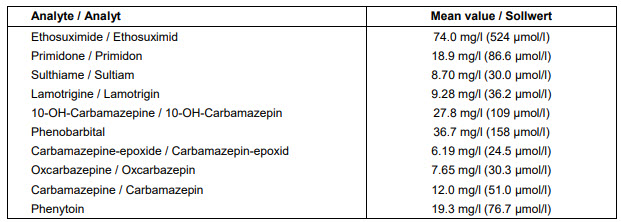 - آنالیتها: کاربامازپین، 10-OH-کاربامازپین، کاربامازپین-اپوکسید، اتوسوکسیمید، لاموتریژین، اکسکاربازپین، فنوباربیتال، فنیتوئین، پریمیدون، سولتیام